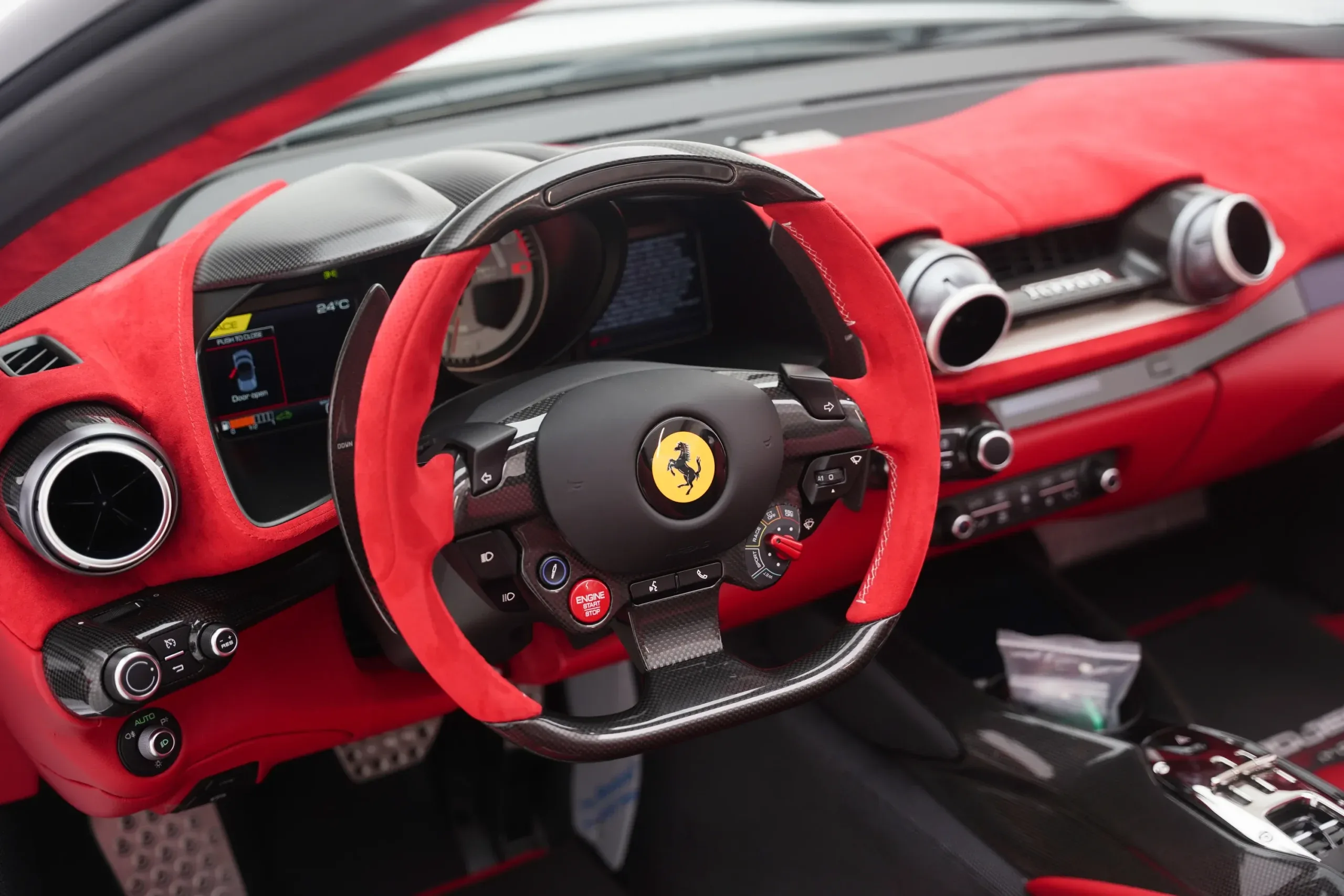 The 2024 812 GTS Competizione Aperta is Ferrari's open-top grand tourer positioned as the ultimate expression of their front-engine V12 lineup. With just 70 kilometers on the clock this example remains essentially new. The naturally aspirated 6.5-liter twelve-cylinder engine delivers raw mechanical feedback through the steering and chassis - there's no turbo lag just instant response and a visceral connection to every input. Performance is genuinely superb: 2.9 seconds to 100 km/h and a 340 km/h top speed that feels attainable. For UAE driving the convertible design offers practical appeal during cooler months though the Competizione trim prioritizes track-focused dynamics over everyday comfort. Ground clearance is modest so speed bumps and rough surfaces require care. The compact footprint suits Dubai parking and the mid-mounted engine behind the front wheels creates good weight balance. This is a driver's car not a luxurious cruiser.